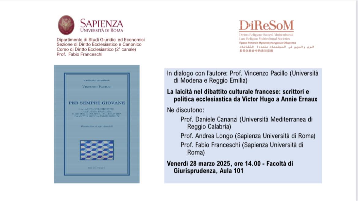28 marzo 2025, Università Sapienza di Roma, presentazione del volume di Vincenzo Pacillo Per sempre giovane. La laicità nel dibattito culturale francese, interventi di prof. D.M. Cananzi, Prof. A. Longo, Prof. F. Franceschi, Prof. V. Pacillo.