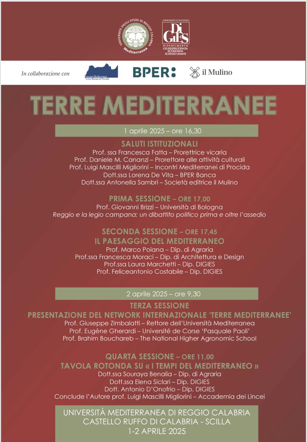 1-2 aprile 2025, Università Mediterranea, Giornate di Studi per la presentazione del Network Terre Mediterranee.